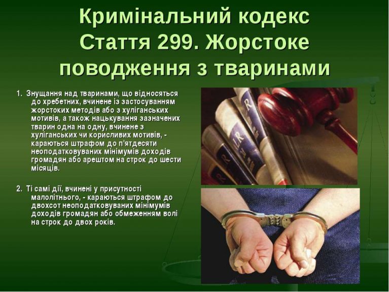 24 листопада 2017 року призначено до розгляду кримінальне провадження відносно громадянина С., який обвинувачується у вчиненні кримінального правопорушення, передбаченого ч. 1 ст. 299 КК України (жорстоке поводження з тваринами).