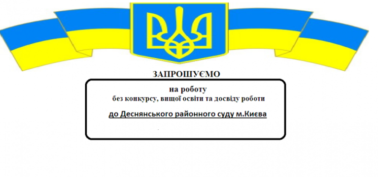 Деснянський районний суд міста Києва запрошує без конкурсу на роботу до суду на посаду діловода, людину з бажання працювати, умінням брати на себе відповідальність.