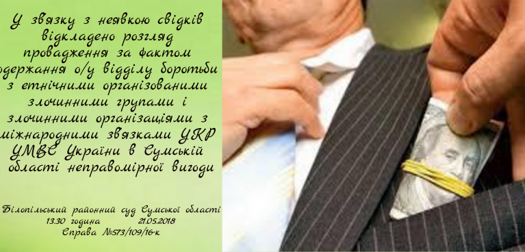 Розгляд кримінального провадження відносно колишнього оперуповноваженого відділу боротьби з етнічними організованими злочинними групами і злочинними організаціями з міжнародними зв’язками УКР УМВС України в Сумській області Г., обвинуваченого за ч. 3 ст. 368 КК України, відкладено на 13 годину 30 хвилин 21 травня 2018 року у зв’язку з неявкою свідків. У судове засідання викликані свідки.
